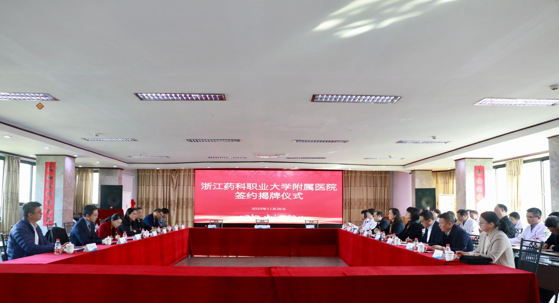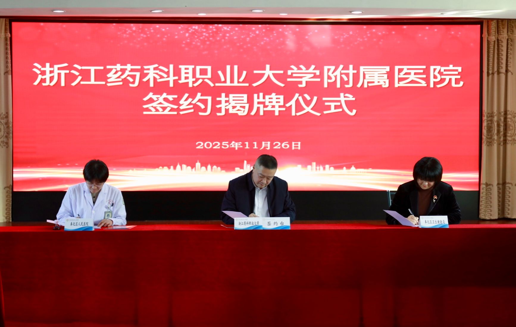 11月26日下午,浙江药科职业大学附属医院揭牌仪式在奉化区人民医院隆重举行。奉化区人民政府与奉化区卫生健康局共同见证了这一时刻。此次合作是校地双方深化医教协同、推进产教融合的关键一步。