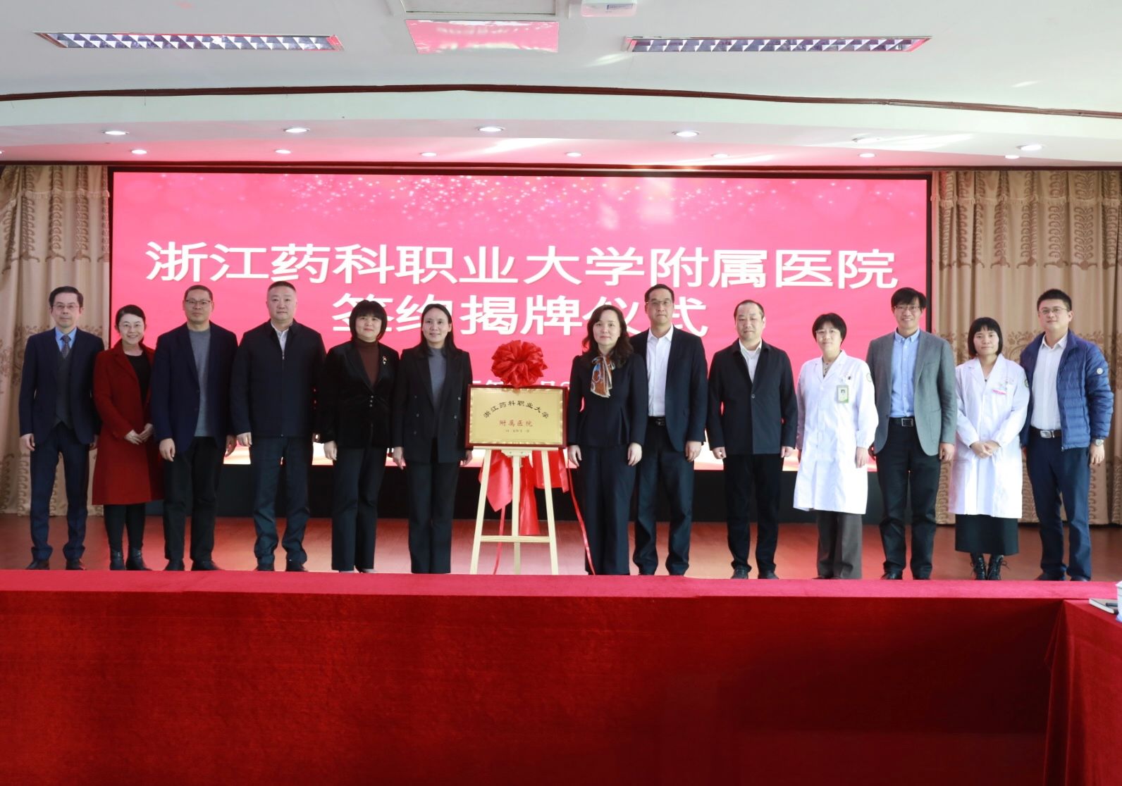 仪式现场,奉化区人民政府副区长庞超静,浙江药科职业大学党委书记阮叶萍,党委委员、副校长姜宇国,奉化区卫生健康局党委书记、局长周女芬,党委委员、副局长王盛强,奉化区人民医院党委书记裘邯军、院长梁静芝,以及学校有关部门负责人共同出席。